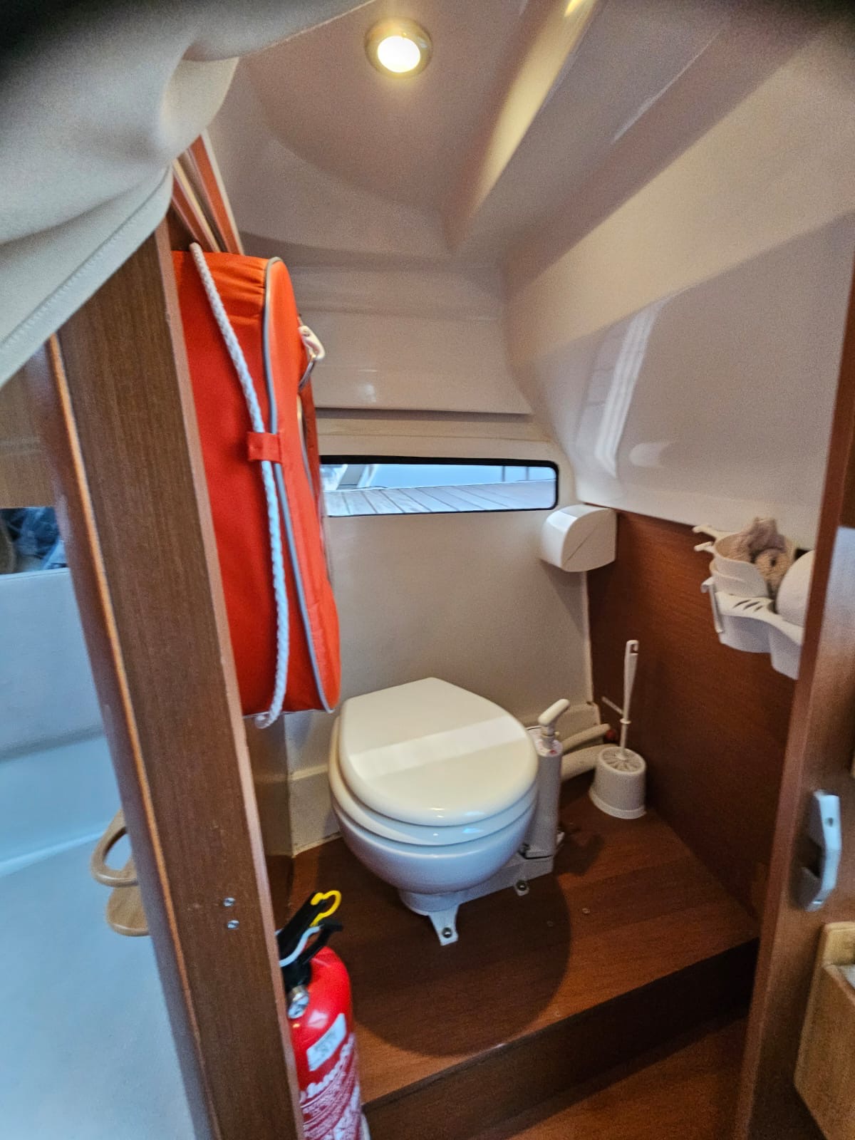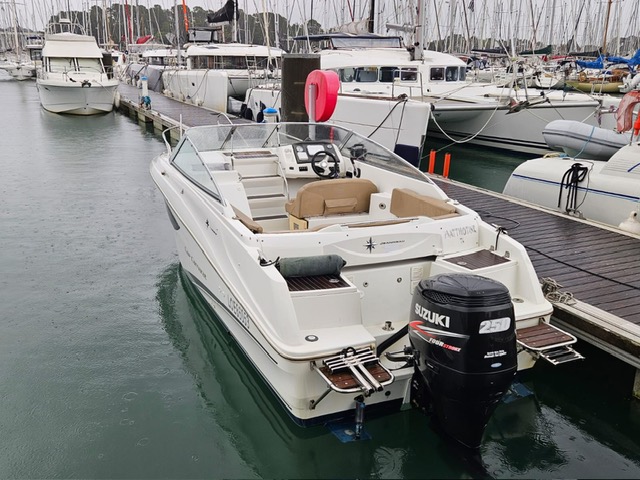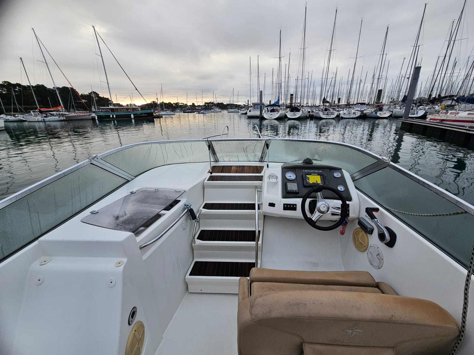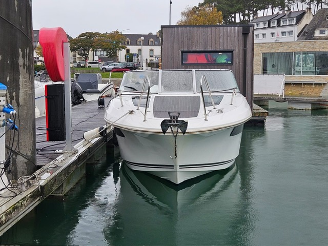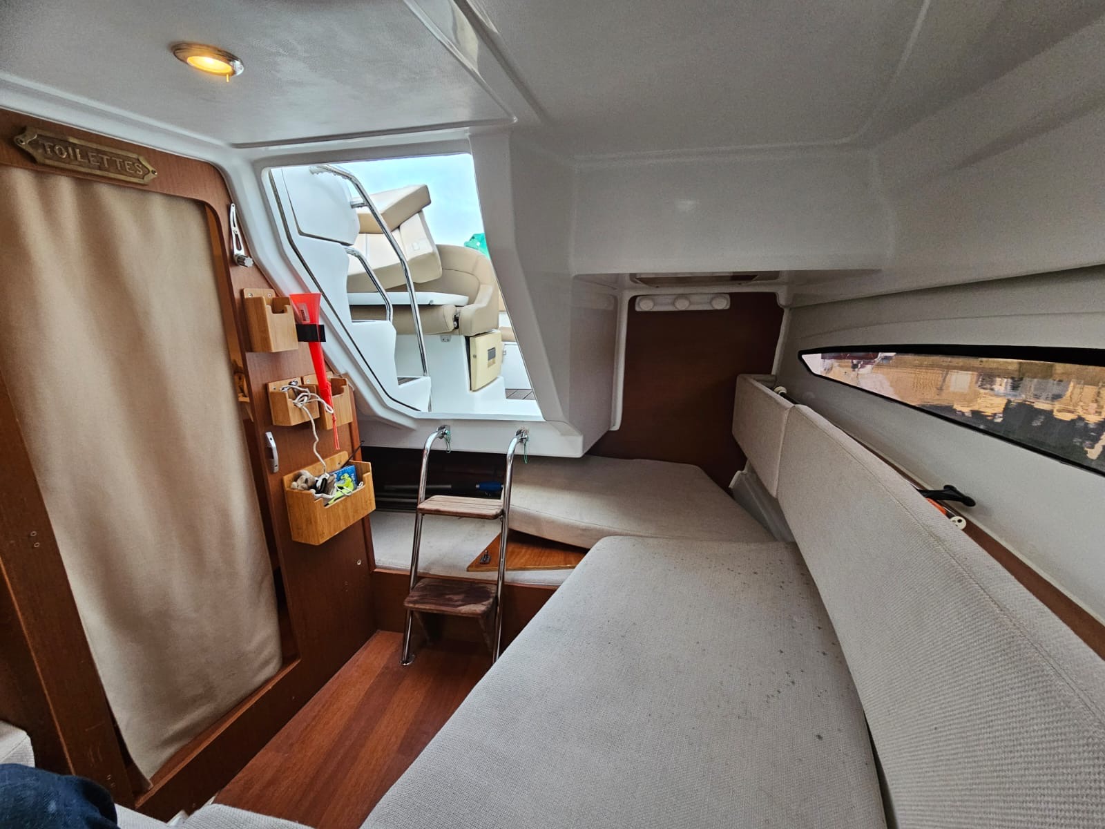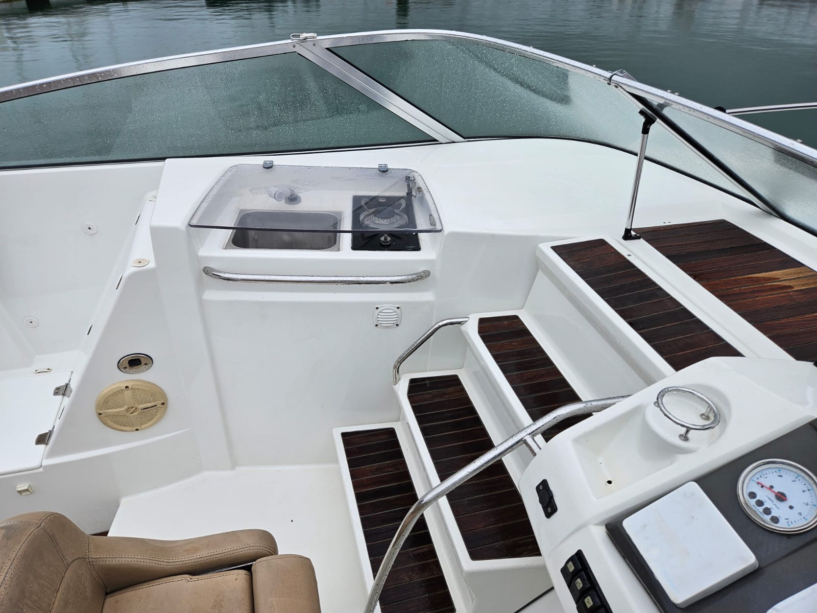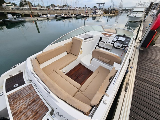Options inclus : GPS/Sondeur LOWRANCE HDS7 – Guindeau électrique – Essuie glace – Table amovible – Bimini – Taud de camping – Flaps – Pont teck – Douchette – Evier – WC Marin avec réserve à eaux noires – Bain de soleil avant et arrière – Échelle de bain – Cabine avec couchage double – Sellerie intérieur et extérieur