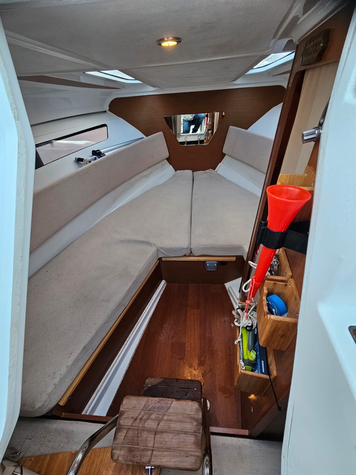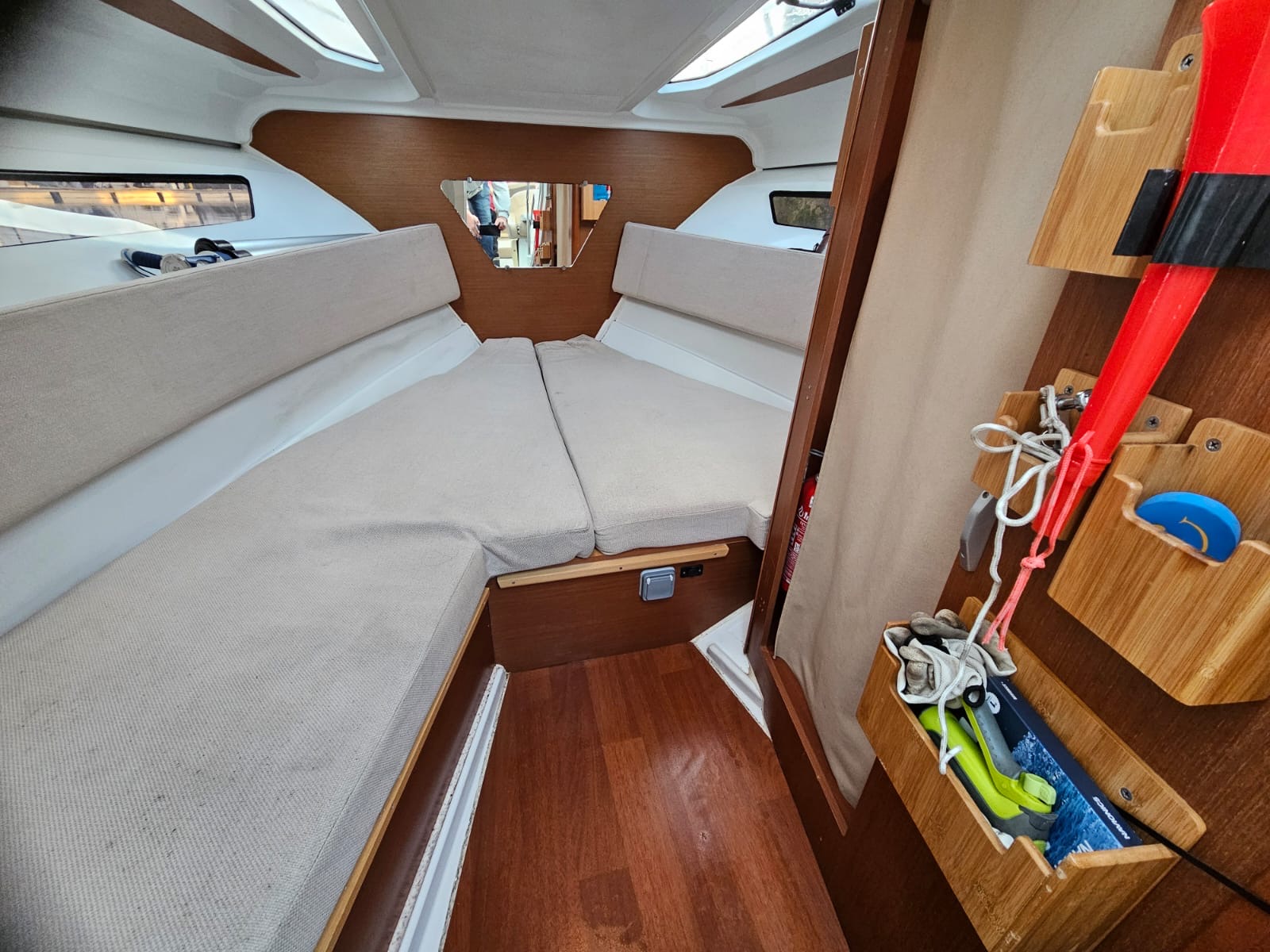 Coque open familial destiné aux sports nautiques et à la petite croisière avec notamment un grand couchage double ainsi qu’un simple sous le pont.