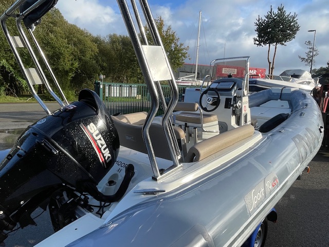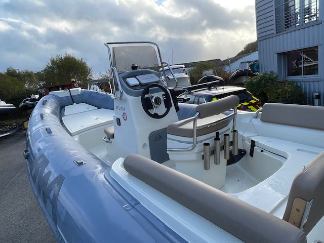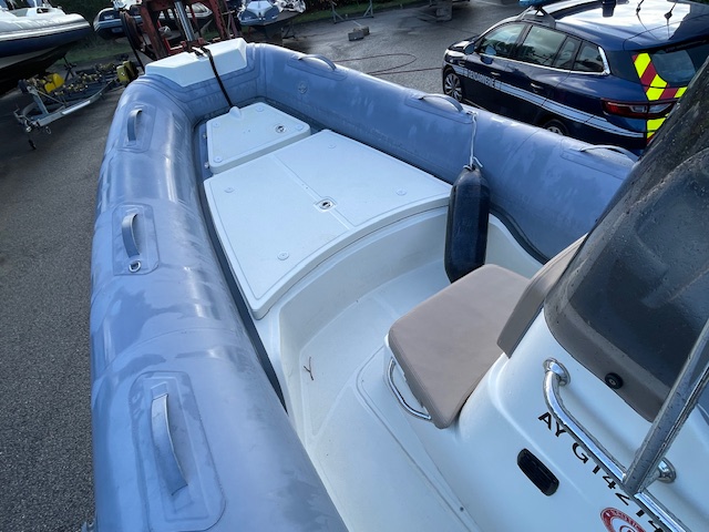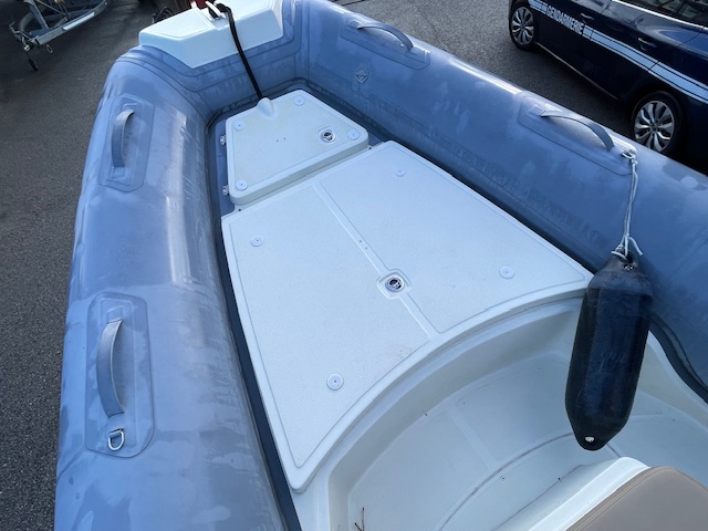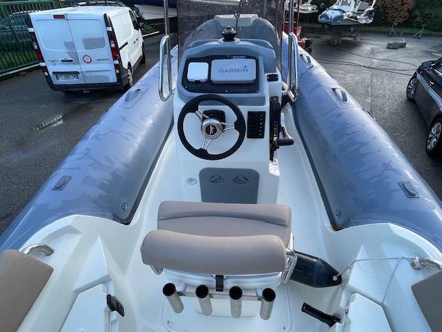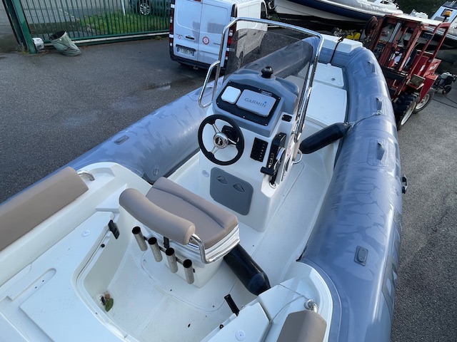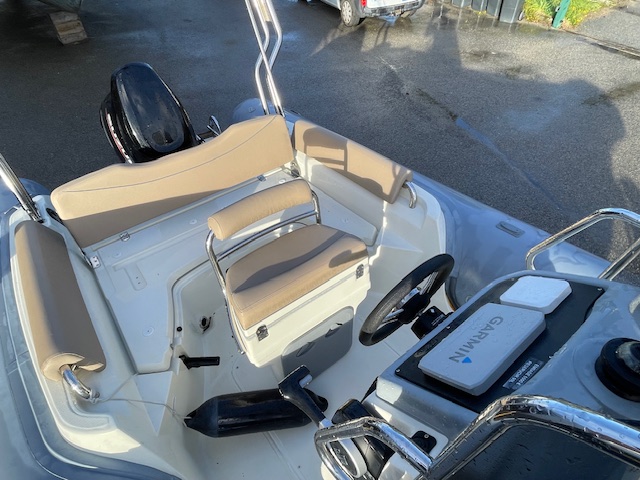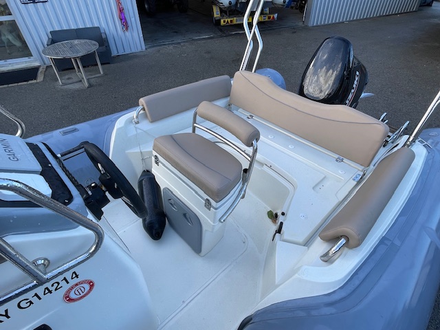 Options inclus : GPS Sondeur Garmin 6 pouces, Sellerie et bain de soleil couleur noisette, Extension de bain de soleil arrière, Armement de sécurité et antifouling, planchette arrière, tube fabric gris, Armement de sécurité 8 pers.