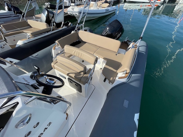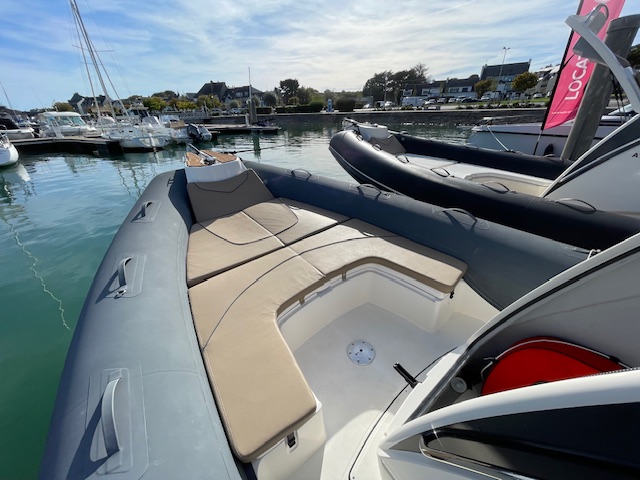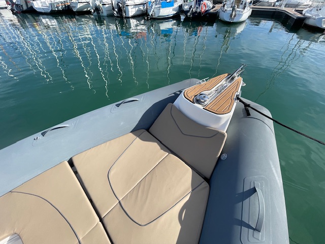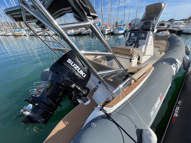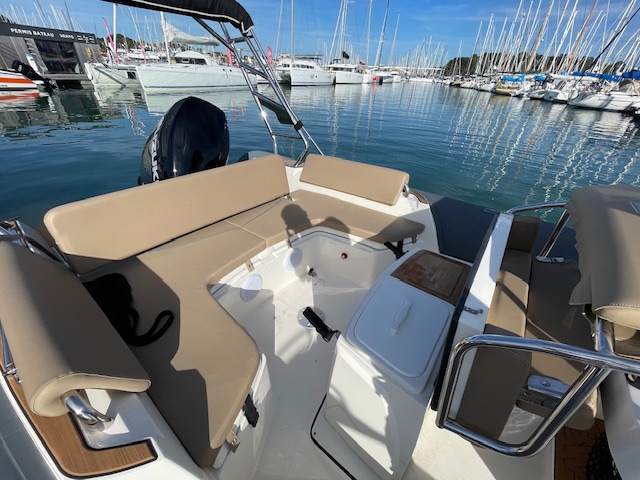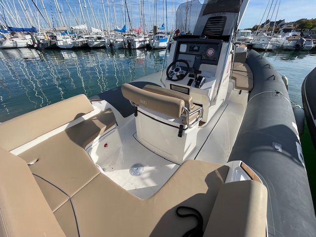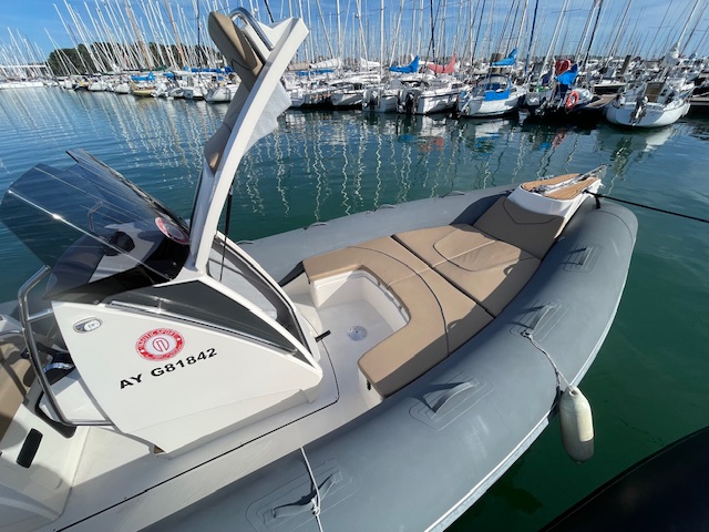 OPTIONS INCLUS : Pack Garmin GPS / Sondeur 92 SV – Système son Fusion – Guindeau Electrique – Roll Bar Elegance – Taud de soleil – Douchette – Bain de soleil avant / arrière avec banquette en U – Planchette arrière extra longues – Table – Feux de navigation – Echelle de bain – Armement sécurité – Antifouling
