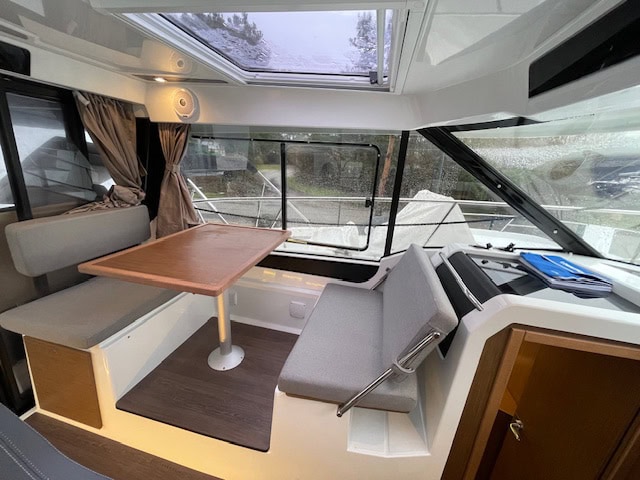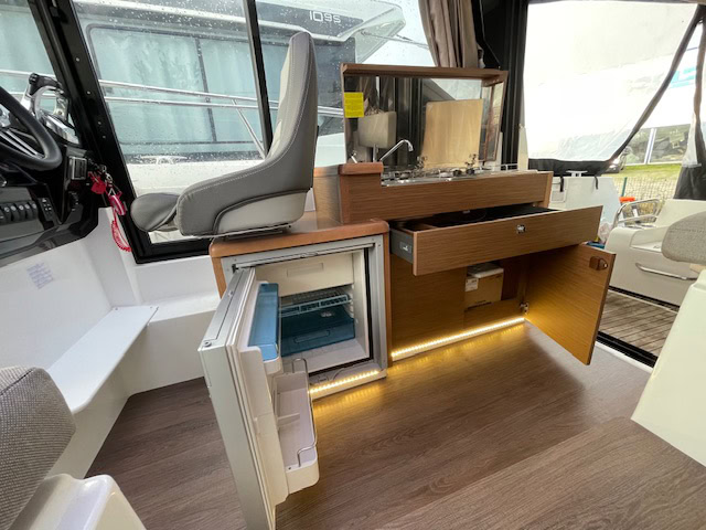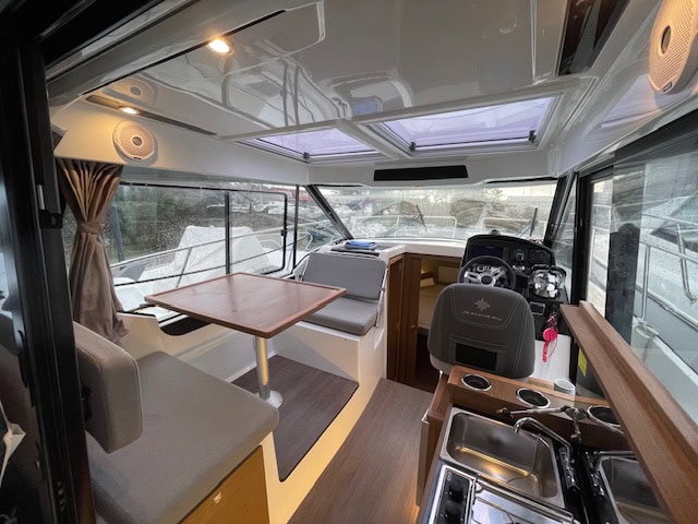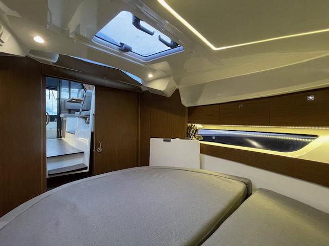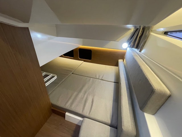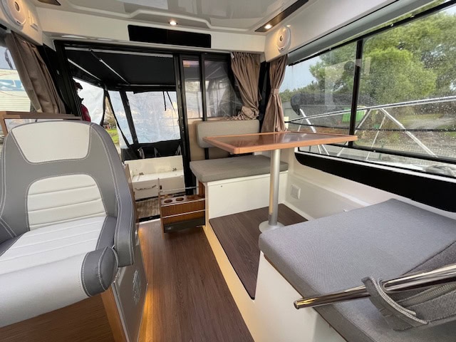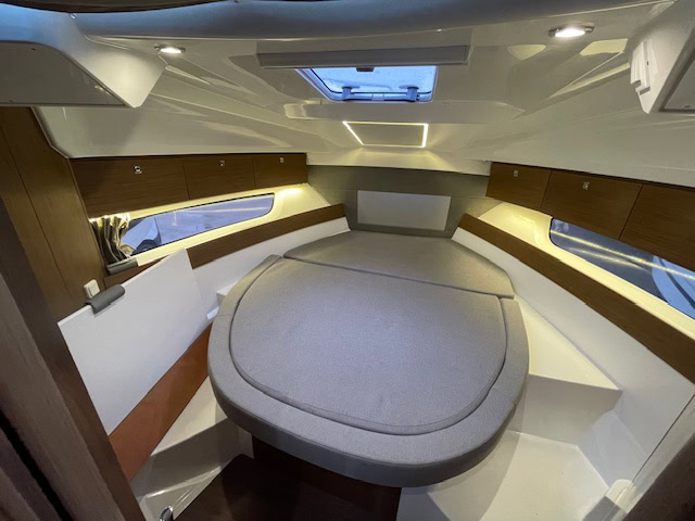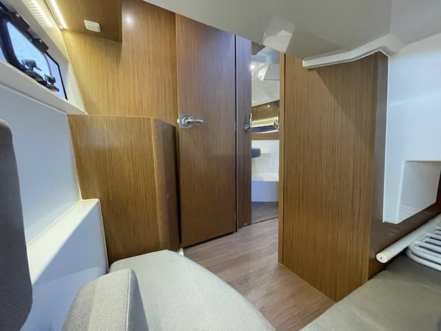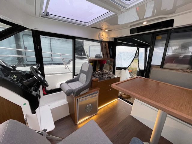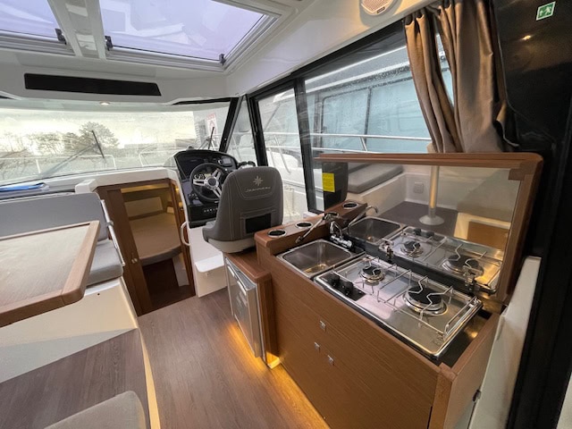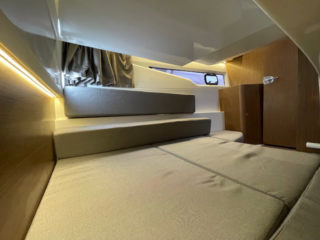 Intérieur Pack Confort et finition première : 2 Cabines avec couchage doubles – 1 salle d’eau avec wc et douche – Chauffe eau – Carré transformable – Coin cuisine avec kitchniette et Réfrigérateur 60L – Eclairage à LEDS de timonerie et cabine avant – Eclairage à LEDS du plancher de cockpit – Asisse sur les toilettes – Rideaux intérieurs