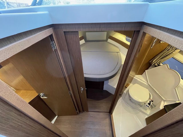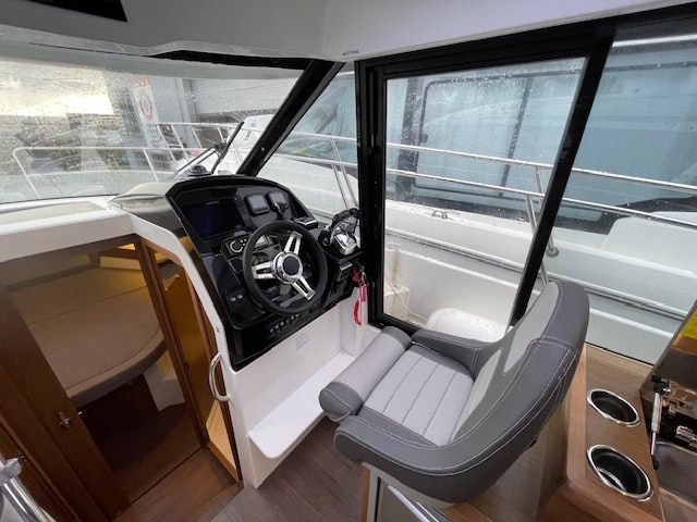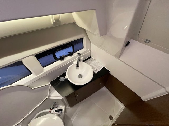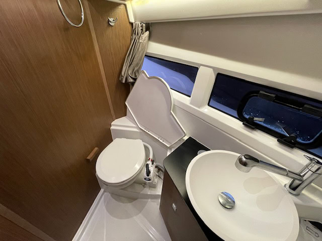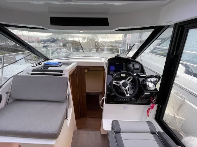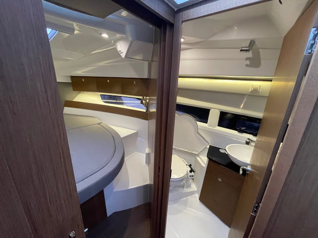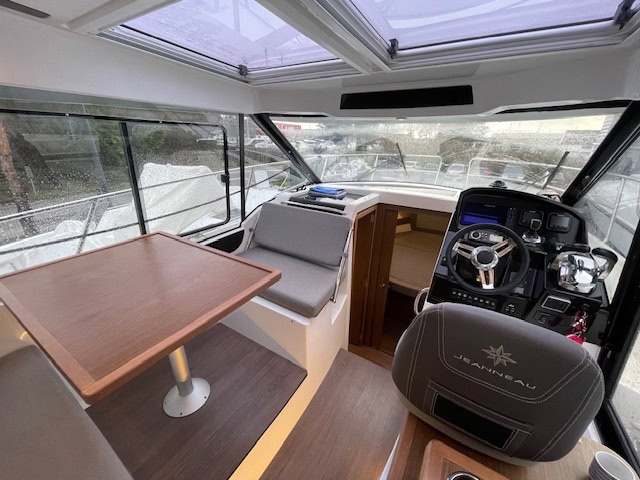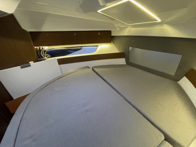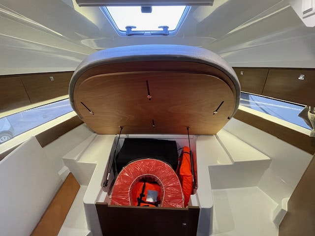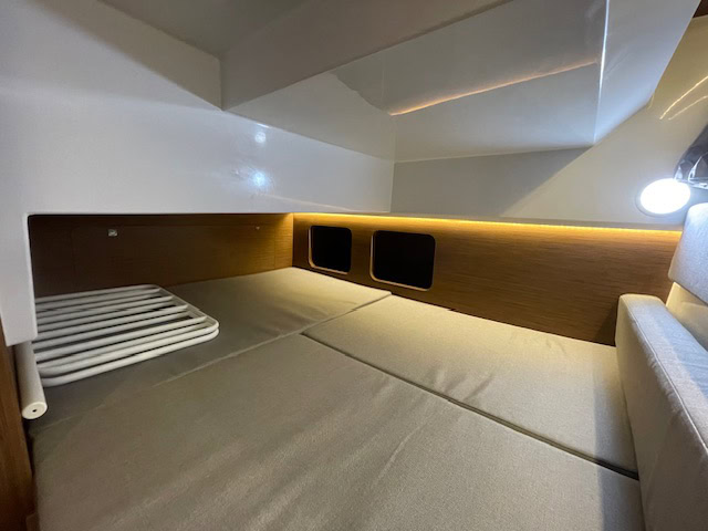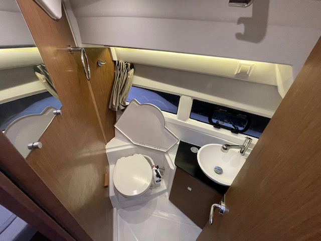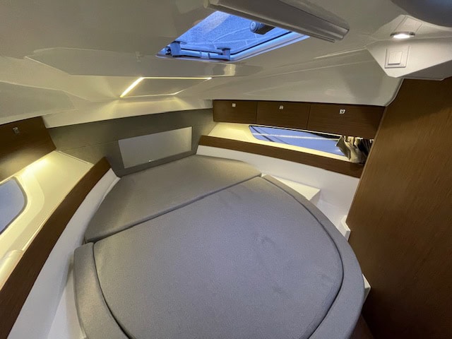 Intérieur Pack Confort et finition première : 2 Cabines avec couchage doubles – 1 salle d’eau avec wc et douche – Chauffe eau – Carré transformable – Coin cuisine avec kitchniette et Réfrigérateur 60L – Eclairage à LEDS de timonerie et cabine avant – Eclairage à LEDS du plancher de cockpit – Asisse sur les toilettes – Rideaux intérieurs